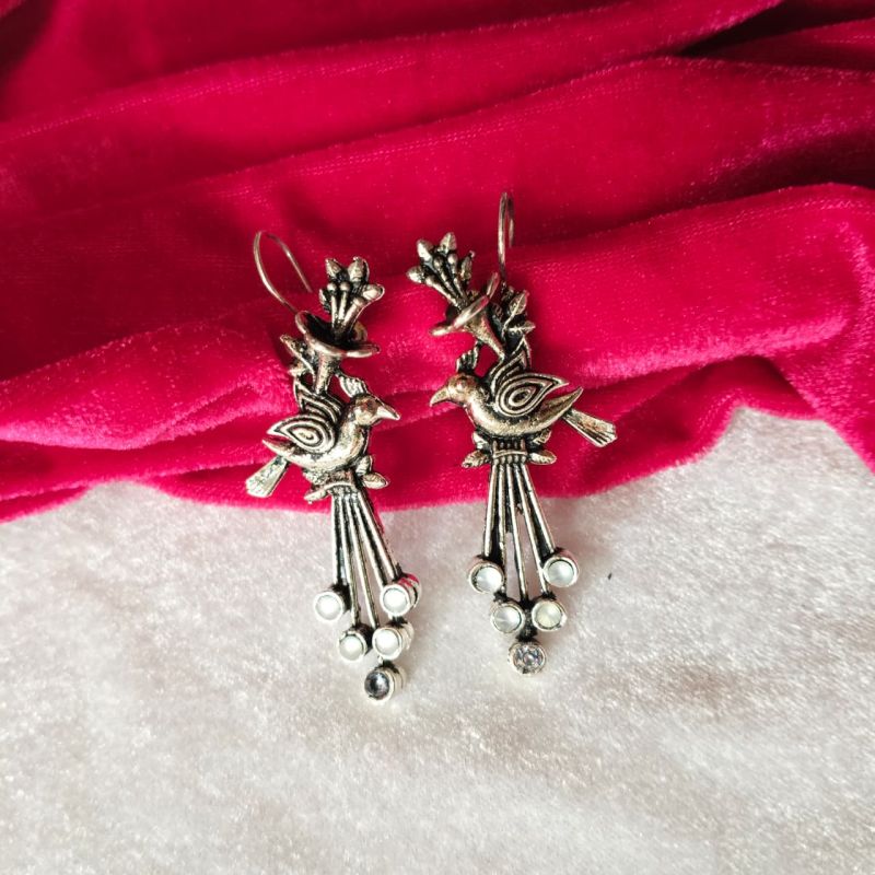 Elegant oxidised silver peacock earrings featuring detailed bird motifs and graceful white stone danglers, perfect for ethnic and festive wear.