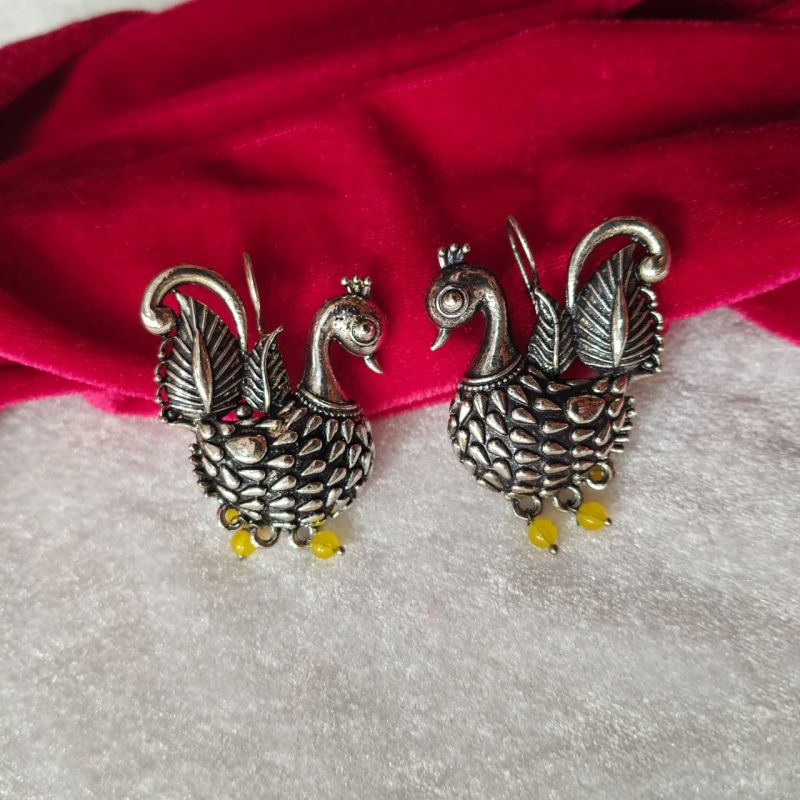 Elegant oxidised silver peacock earrings featuring detailed craftsmanship and bright yellow bead danglers, perfect for ethnic and festive wear.