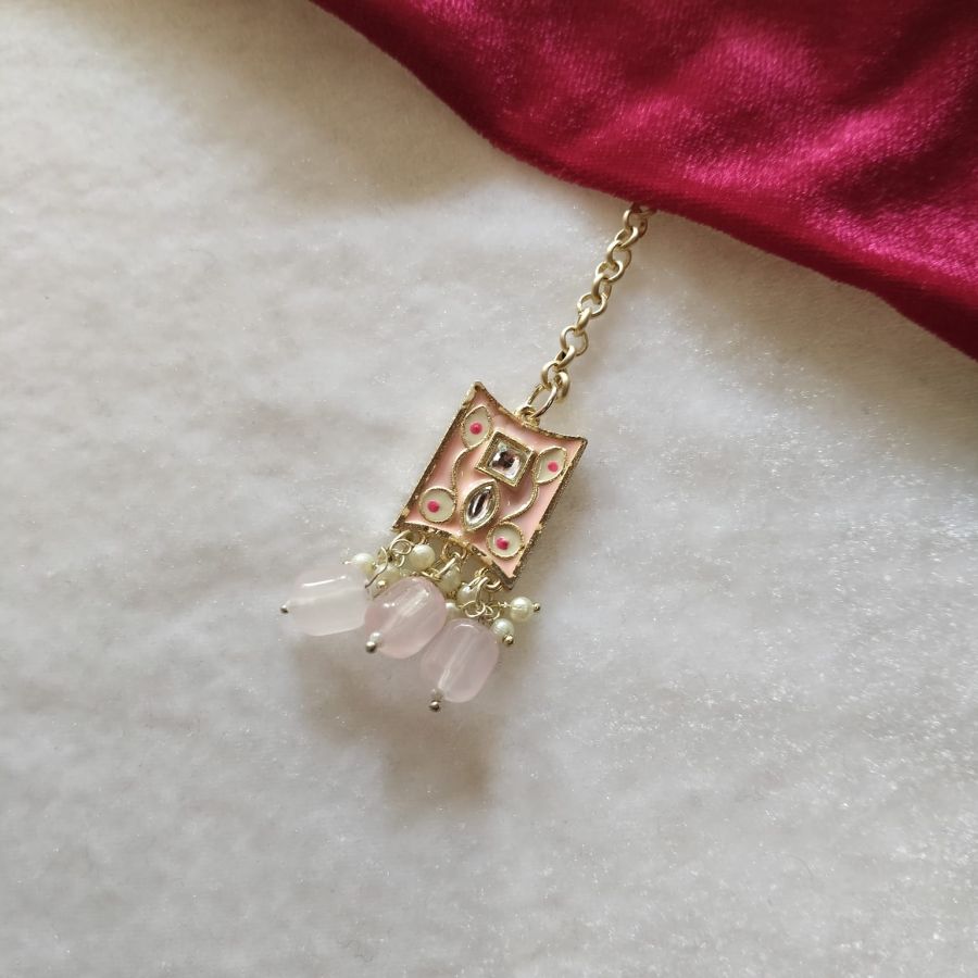 Elegant pastel pink meenakari kundan choker necklace set adorned with pearl detailing and soft pink bead drops, perfect for festive and wedding wear.