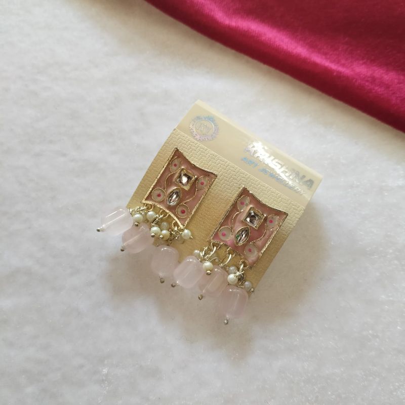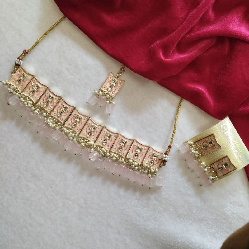 Pastel Pink Meenakari Kundan Choker Necklace Set with Pearl & Bead Drops