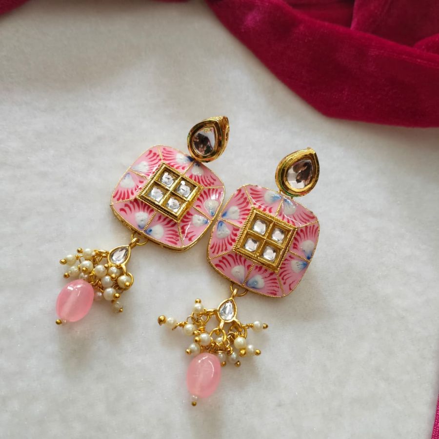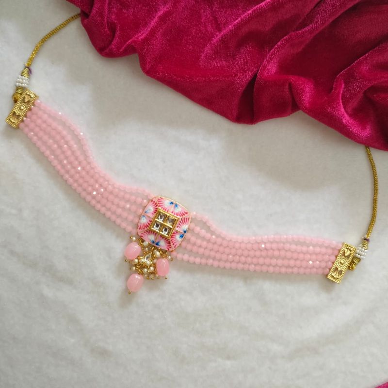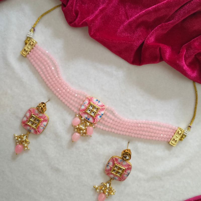 Elegant pink beaded choker necklace set with kundan-style enamel pendant and matching drop earrings, perfect for festive and ethnic wear.