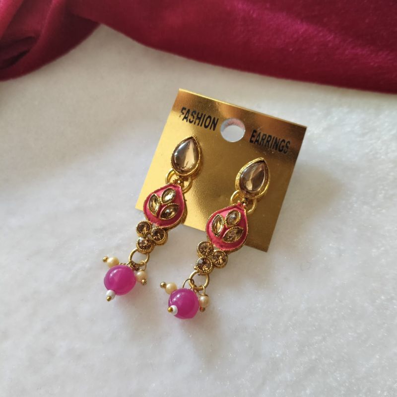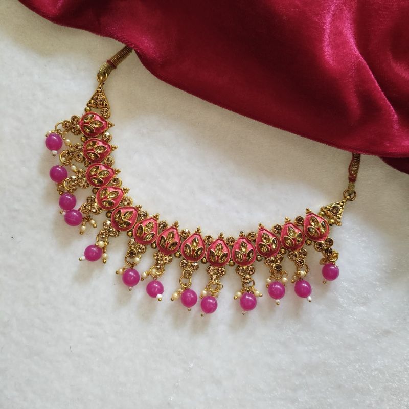 Pink Enamel Kundan Necklace Set with Bead Drops