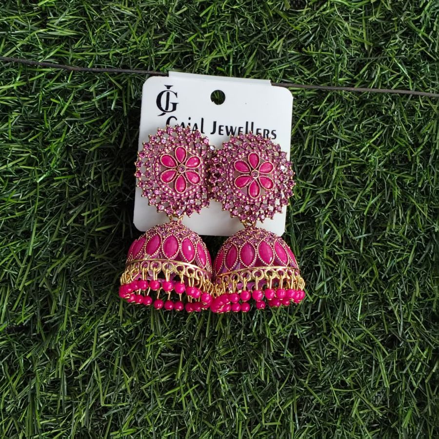 Stylish pink floral stone jhumka earrings with intricate gold detailing and pink bead hangings, perfect for festive and wedding wear.