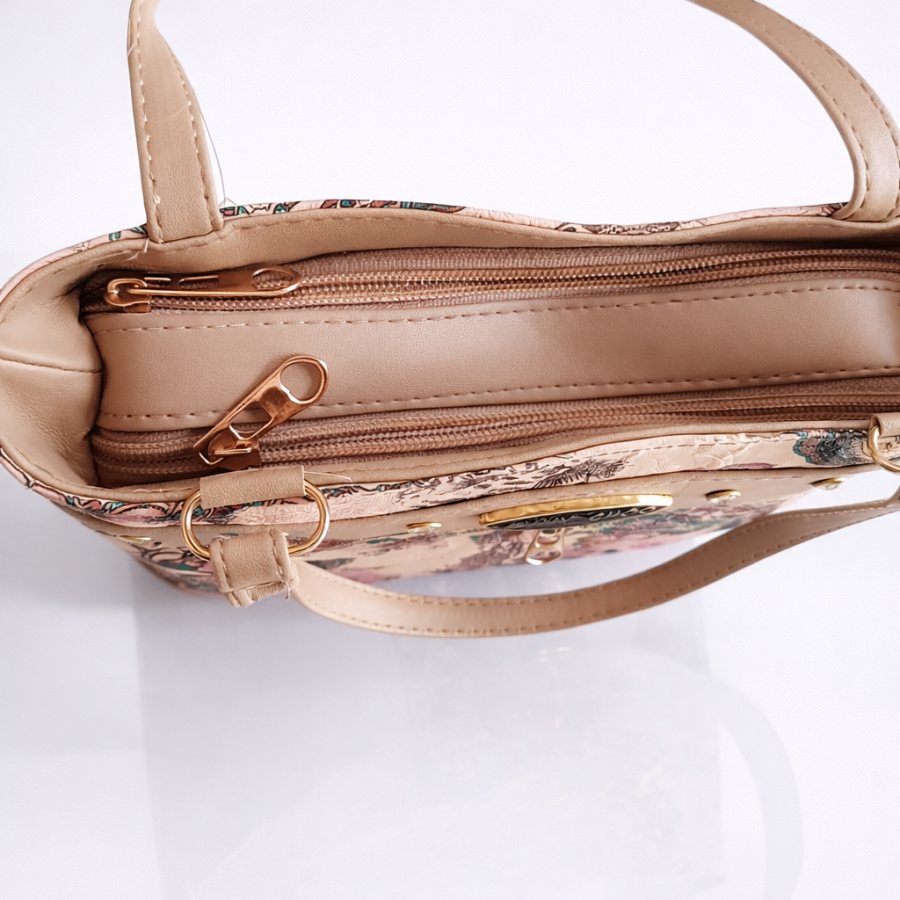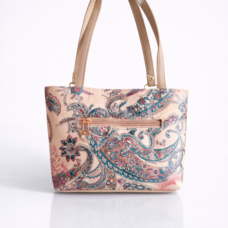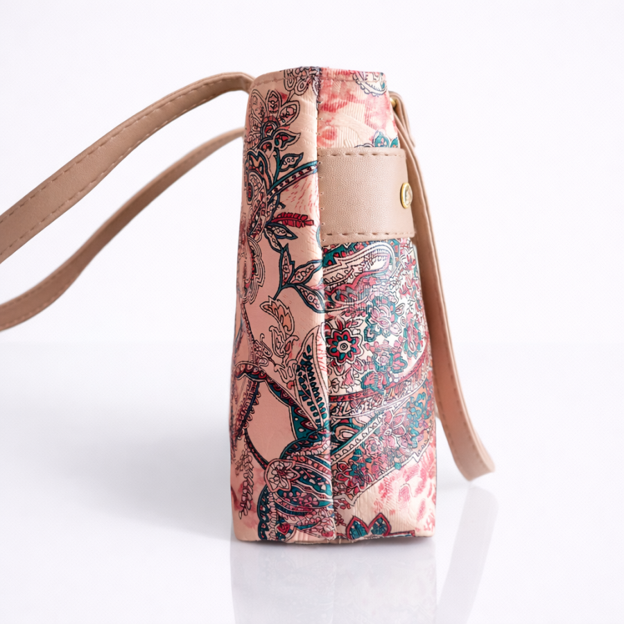 A stylish pink paisley print shoulder handbag with elegant stud detailing and front zipper pocket. Perfect for daily use, outings, and trendy looks.