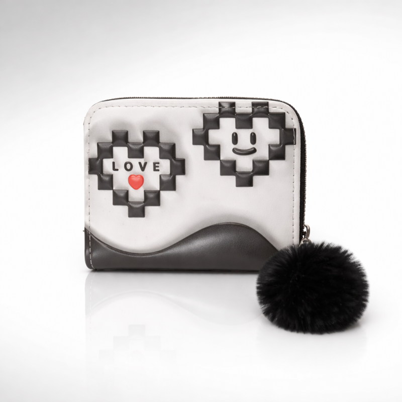 Add a modern and playful twist to your accessories with this stylish mini zip wallet, designed with unique pixel-style heart graphics and a charming “LOVE” detail. The black and white color combination gives it a clean, contemporary look, while the small red heart accent adds a subtle pop of color.