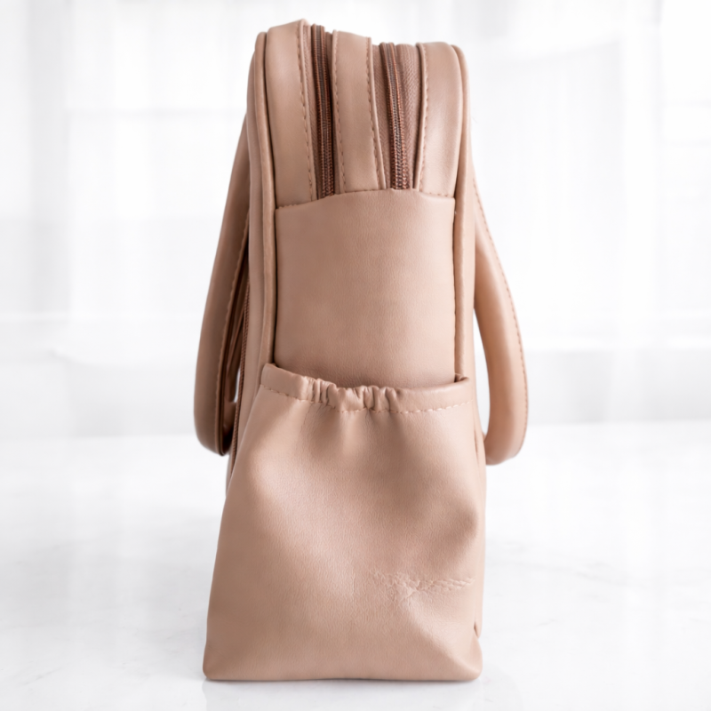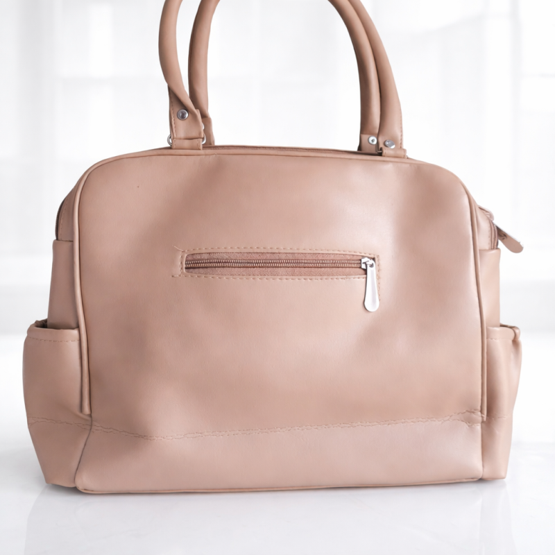 Elegant beige quilted handbag with multiple zipper pockets and gold oval metal accent. Spacious, stylish and perfect for office, travel and daily use.