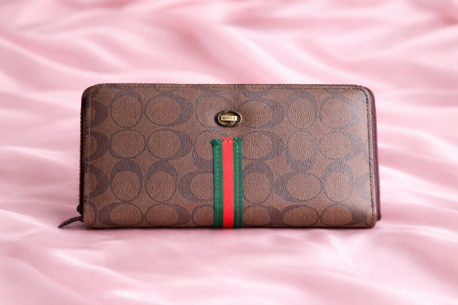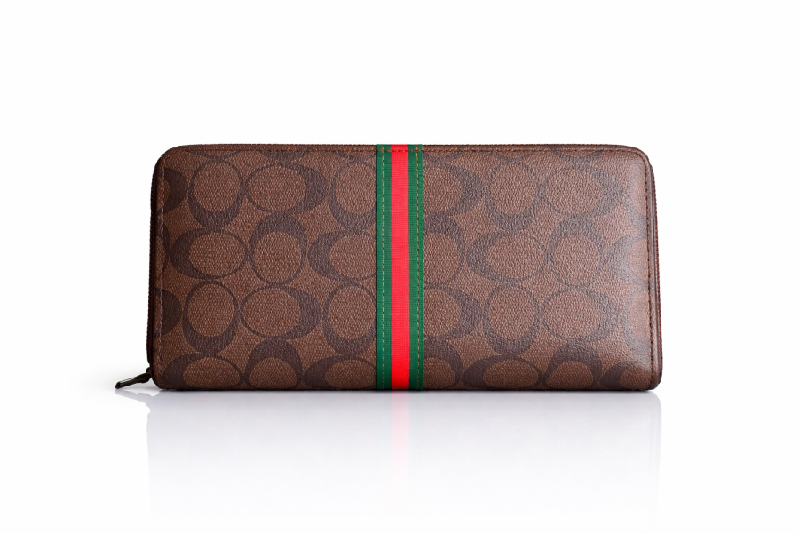 Elegant brown monogram women’s long wallet with stylish green-red center stripe and zip closure. Spacious, durable and perfect for daily use, travel and gifting.