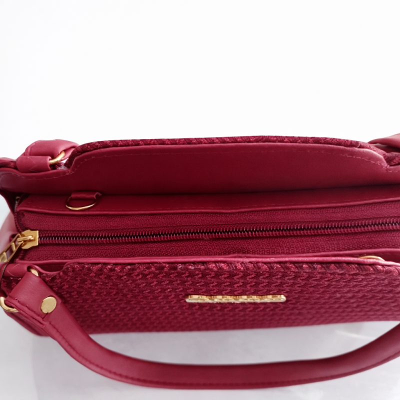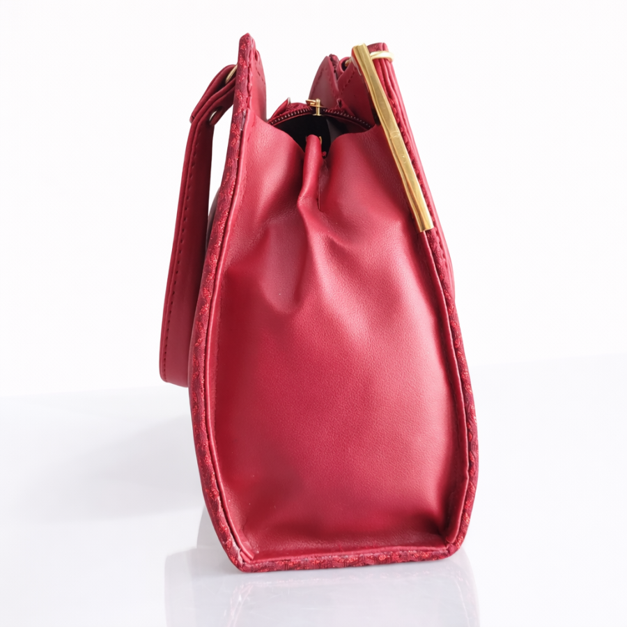 Stylish magenta textured women’s handbag featuring elegant gold side accents and sturdy top handles. Perfect for parties, office, and special occasions.