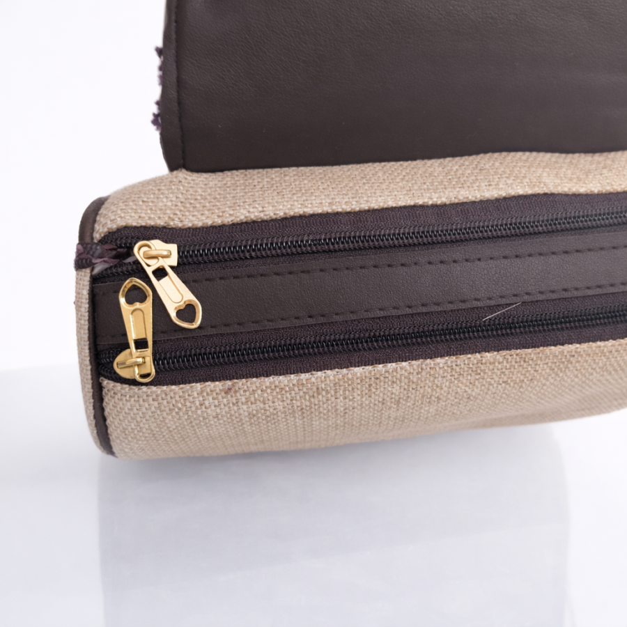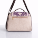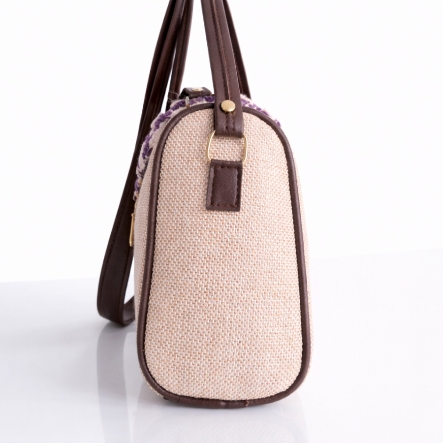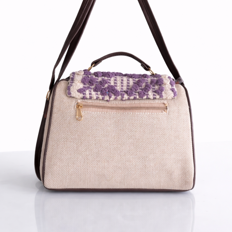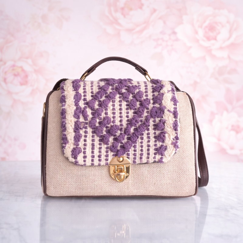 Elegant beige sling handbag featuring a purple crochet patterned flap with gold lock closure and adjustable strap. Perfect for casual and festive wear.