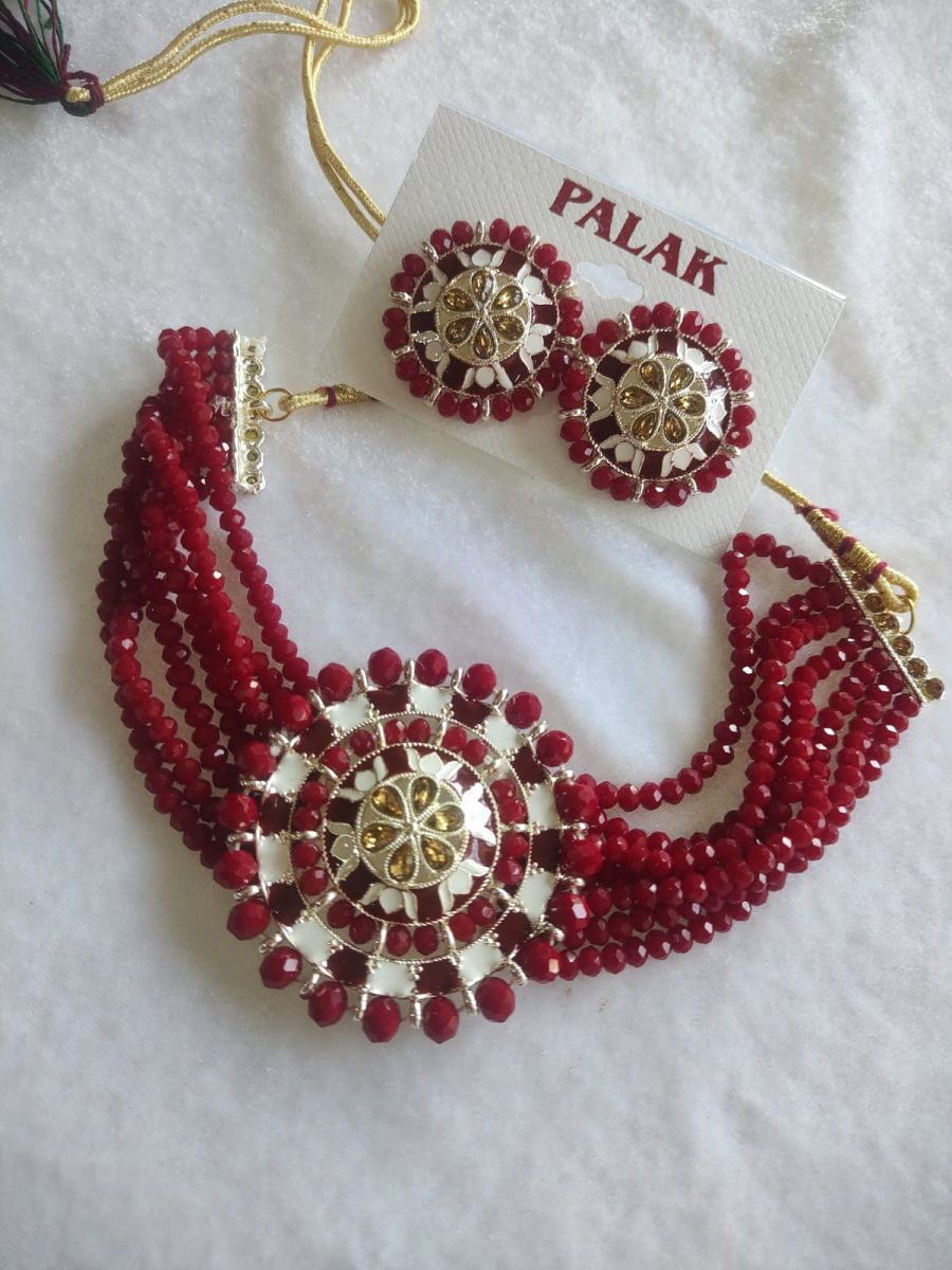 Elegant red beaded choker necklace set featuring a floral meenakari centerpiece with matching earrings, perfect for weddings, festive wear, and party occasions.