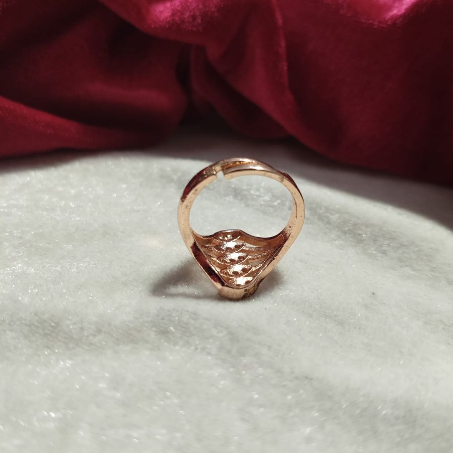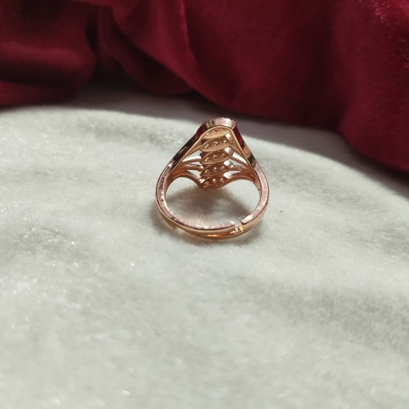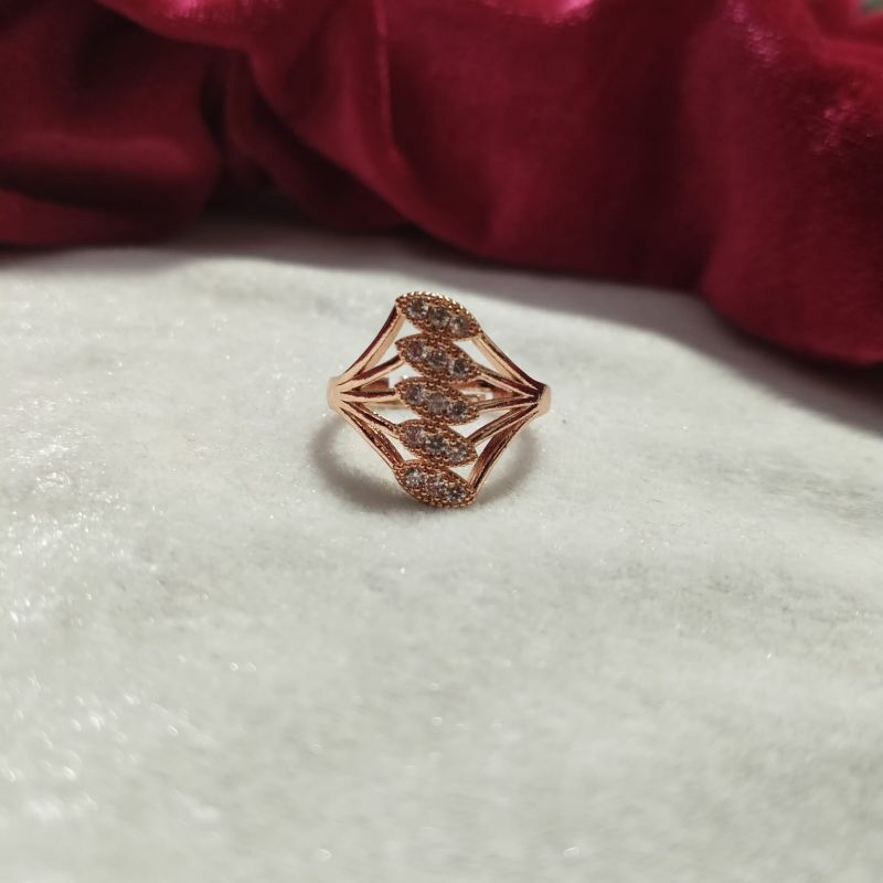 A trendy rose gold plated ring featuring a unique geometric multi-layer design studded with sparkling AD crystals. Perfect for parties, weddings, and elegant everyday styling.