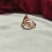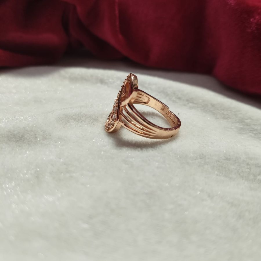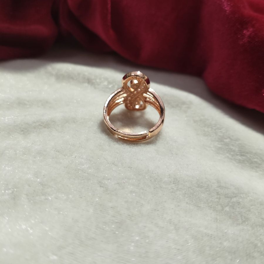 A stylish rose gold plated adjustable ring featuring an infinity swirl design embellished with sparkling crystals. Perfect for party wear, festive occasions, and daily elegance.