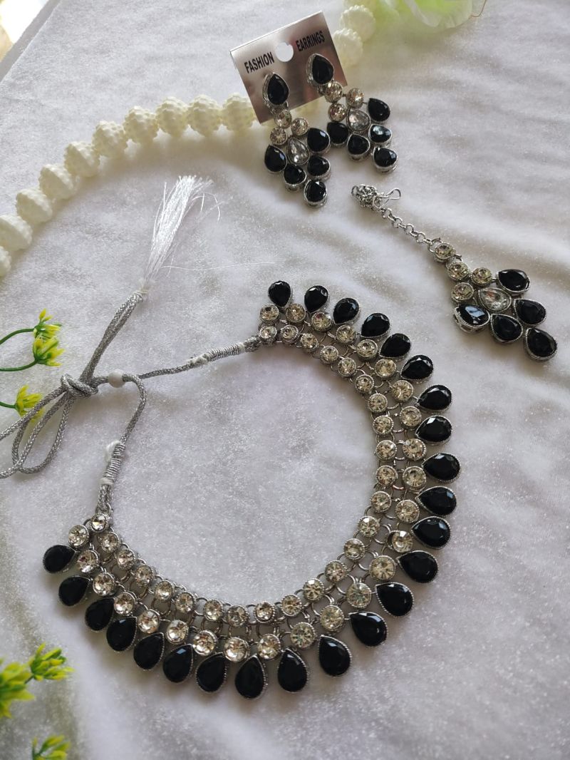 Elegant black teardrop stone choker set with sparkling American Diamond detailing, including matching earrings and maang tikka – perfect for weddings and party wear.