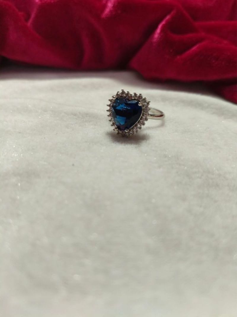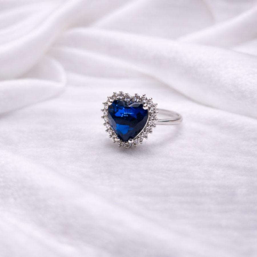 Elegant silver plated ring featuring a deep royal blue heart-shaped crystal surrounded by sparkling halo stones. Perfect for parties, gifting, and special occasions.