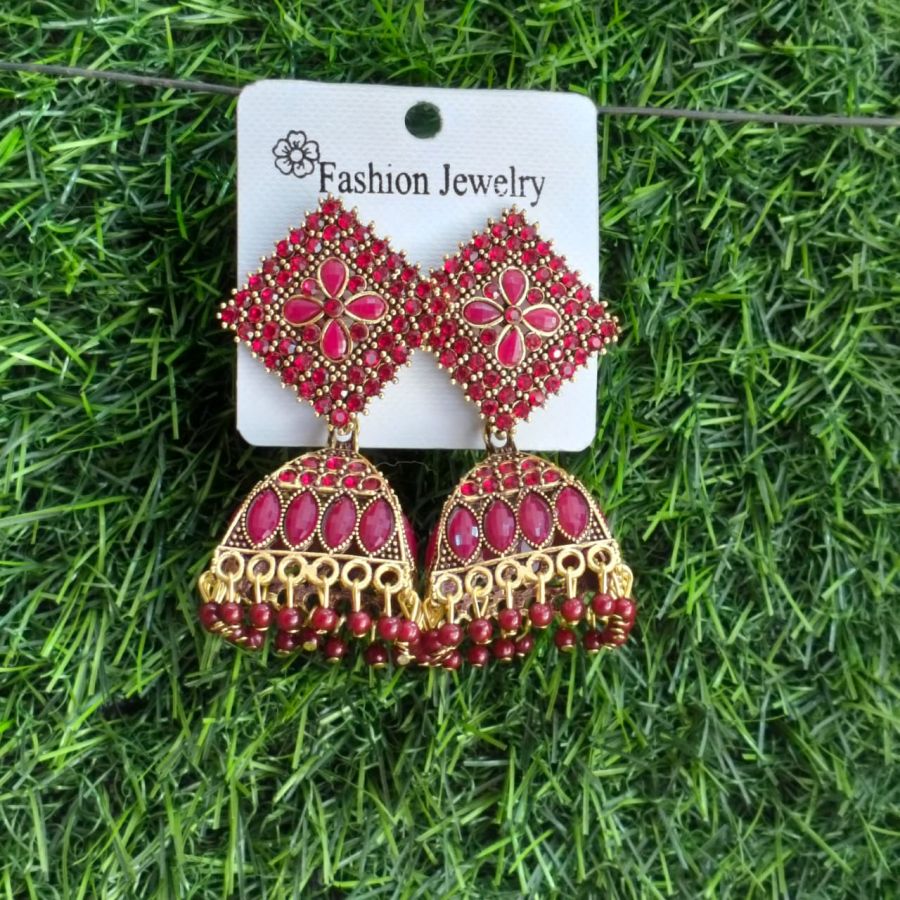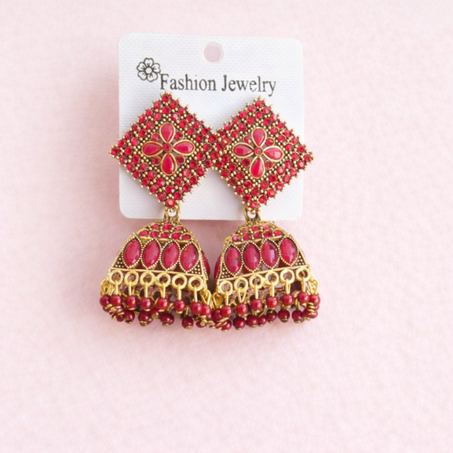 Royal Red Stone Antique Gold Plated Jhumka Earrings