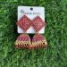 Stunning antique gold-plated jhumka earrings adorned with vibrant red stones and bead hangings, perfect for weddings and festive occasions.