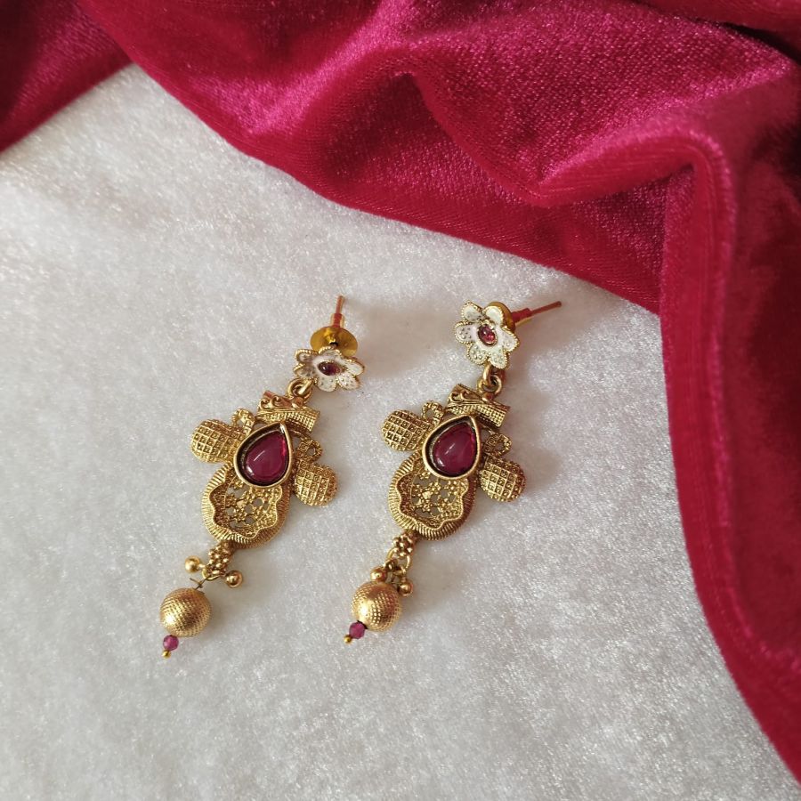 A regal long Rani Haar necklace set crafted in antique gold finish featuring elegant pearl strands, ruby-toned beads, and an intricately carved statement pendant with matching earrings. Perfect for weddings, festive occasions, and traditional attire.