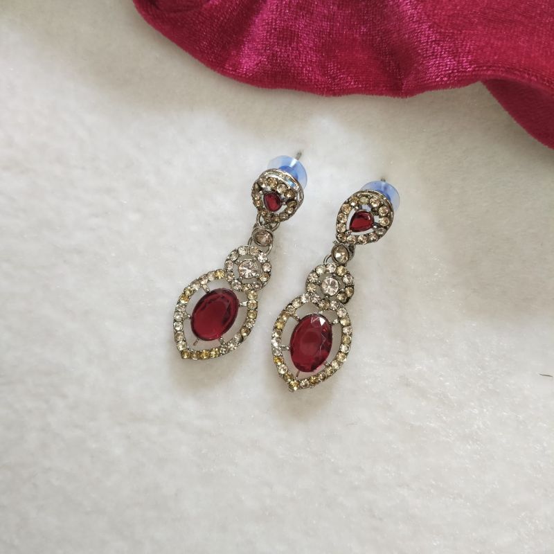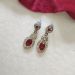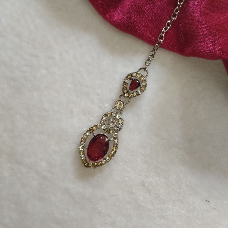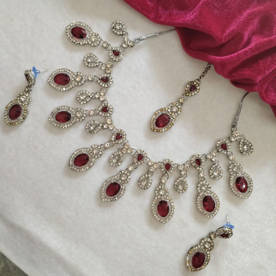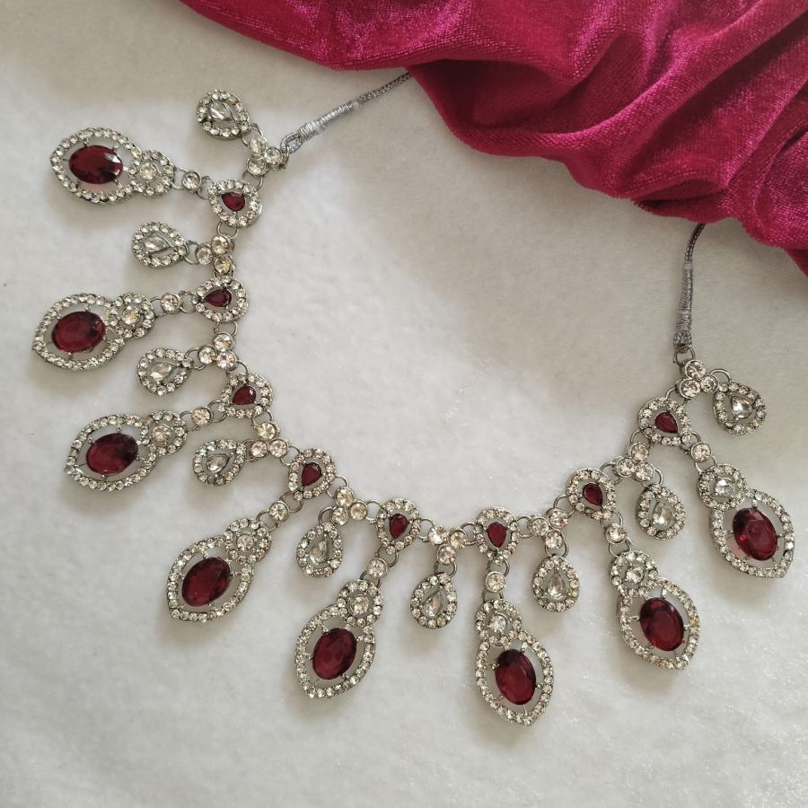 A stunning ruby red crystal drop necklace set with sparkling white stones, designed to add royal elegance to bridal and party wear looks.