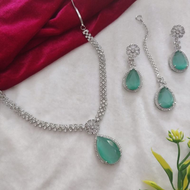 Elegant silver-toned AD choker necklace set featuring sparkling stones with a sea green teardrop centerpiece, paired with matching earrings and maang tikka.