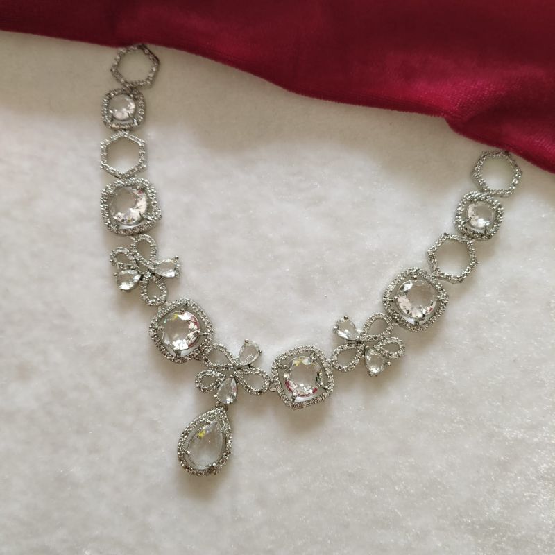 An elegant silver-finish necklace set featuring crystal floral and geometric motifs with a teardrop pendant and matching statement earrings.