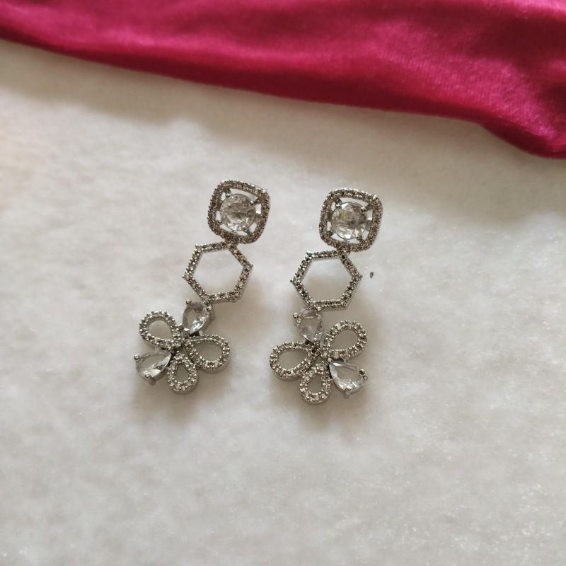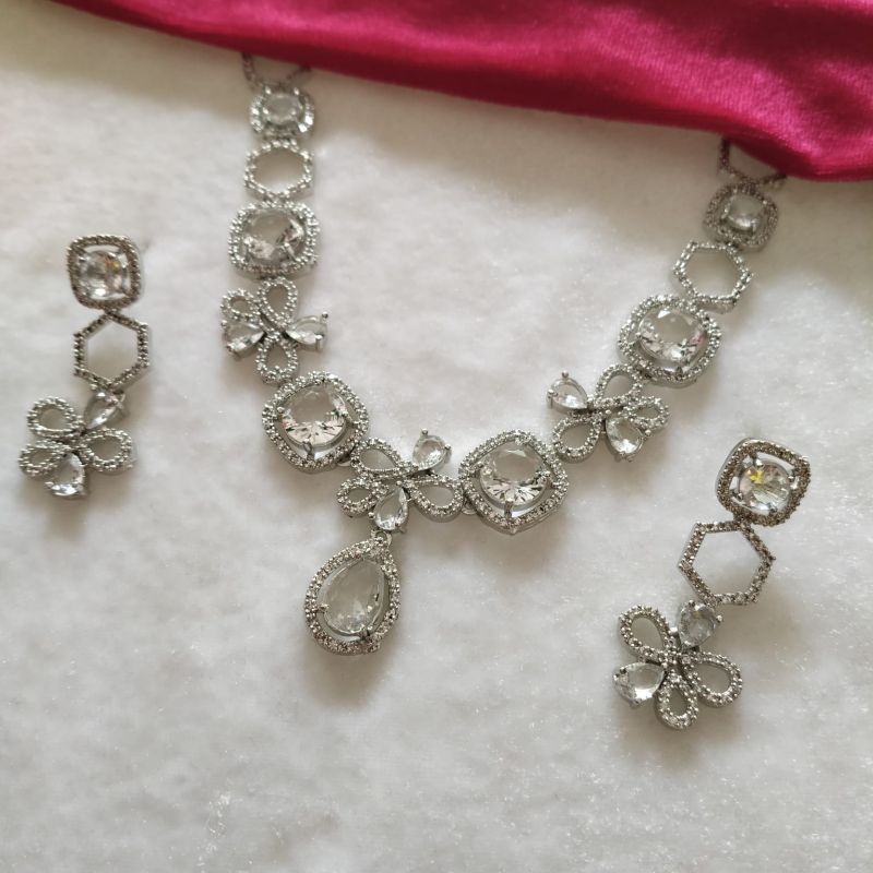 Silver Finish Crystal Floral & Geometric Designer Necklace Set with Earrings