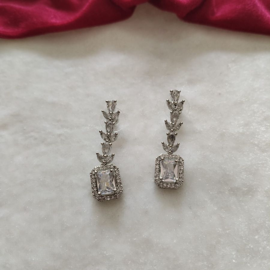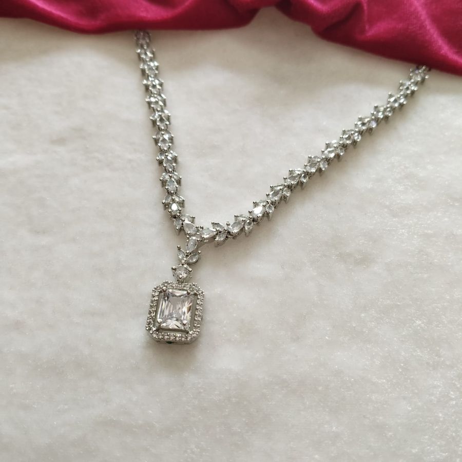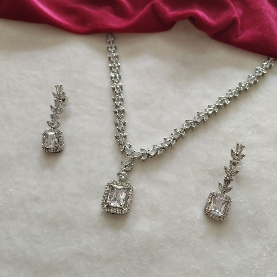 A classy silver-finish necklace set featuring a sparkling square crystal pendant with matching elegant drop earrings.