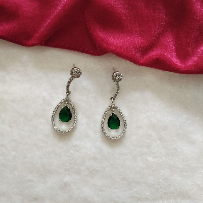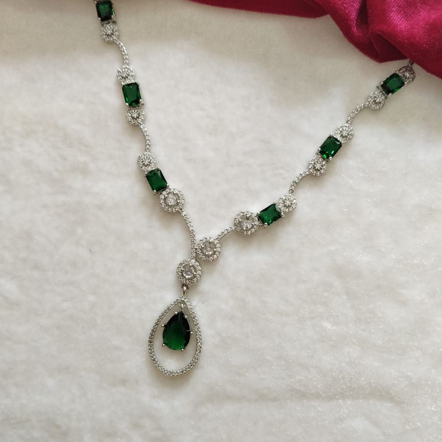 A classy silver-finish necklace set adorned with sparkling white stones and elegant green teardrop crystals, paired with matching drop earrings.