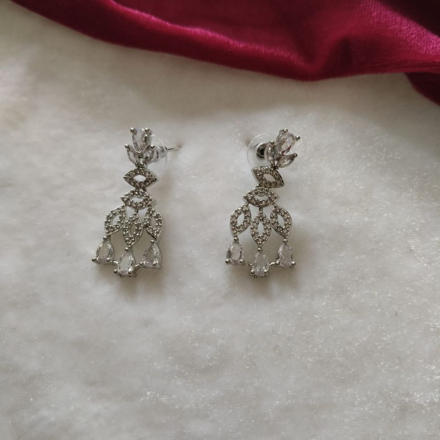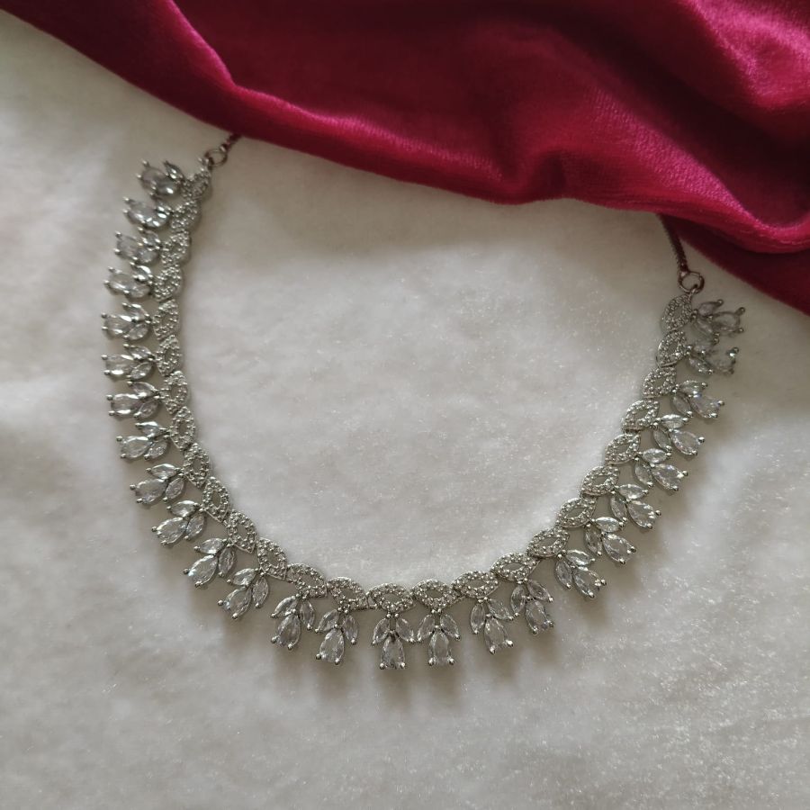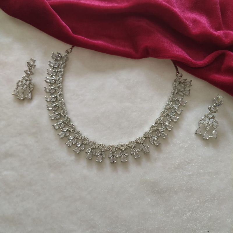 A graceful silver-finish necklace set featuring leaf-shaped crystal drops with matching elegant earrings, perfect for festive and party wear.