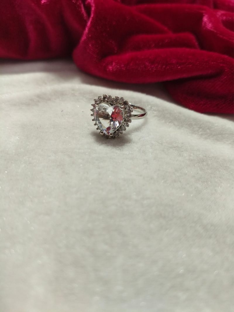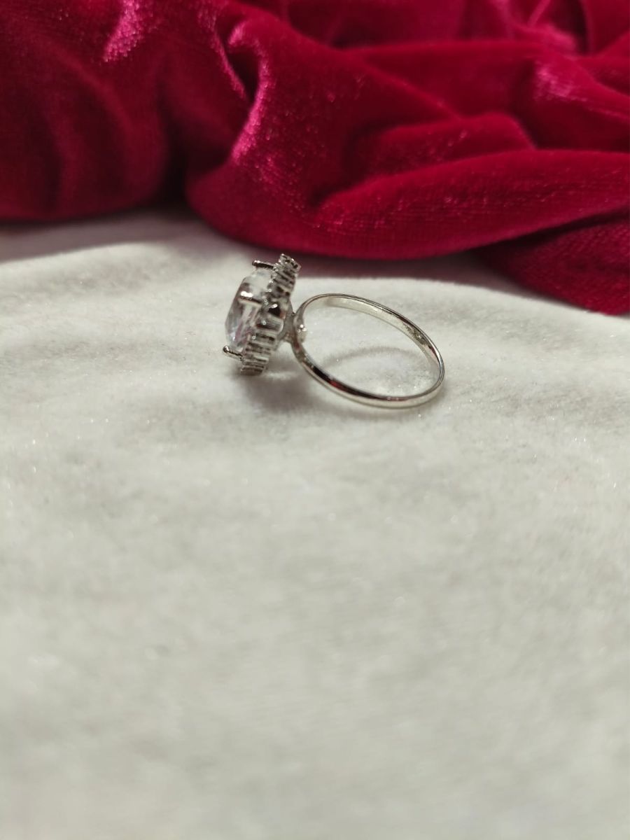 A stunning silver-plated ring featuring a heart-shaped clear crystal stone surrounded by sparkling American Diamond zircon stones, perfect for elegant everyday and party wear.