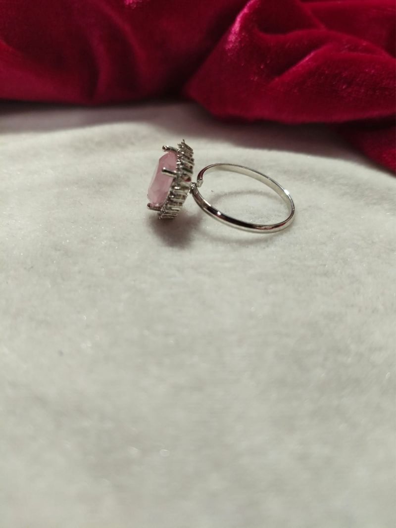 A beautiful silver-plated ring featuring a soft pink heart-shaped crystal stone surrounded by sparkling American Diamond zircon stones, perfect for daily wear and special occasions.