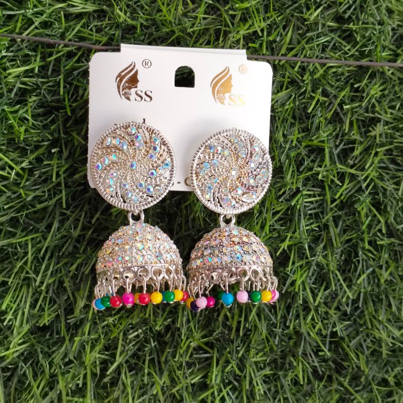 Elegant silver-plated jhumka earrings embellished with sparkling stones and colorful bead hangings, perfect for festive and party wear.