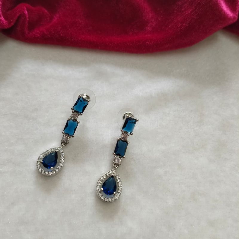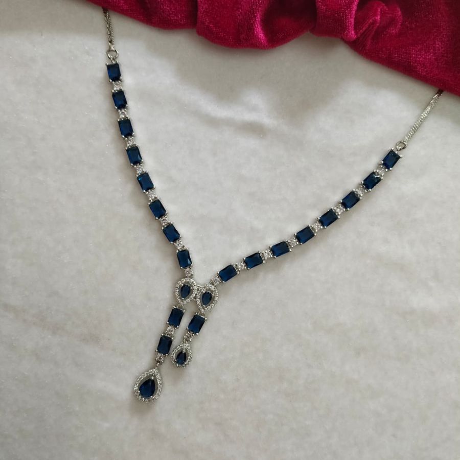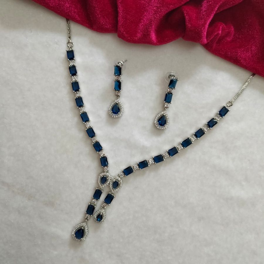 Stylish silver-tone necklace set featuring deep blue stones and sparkling crystals, paired with elegant drop earrings for a classy party and evening look.
