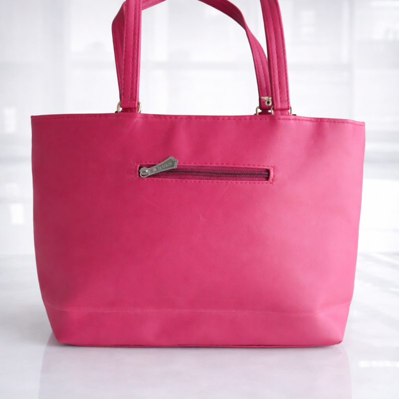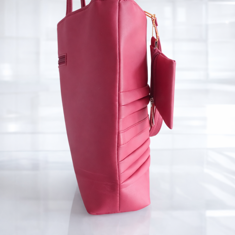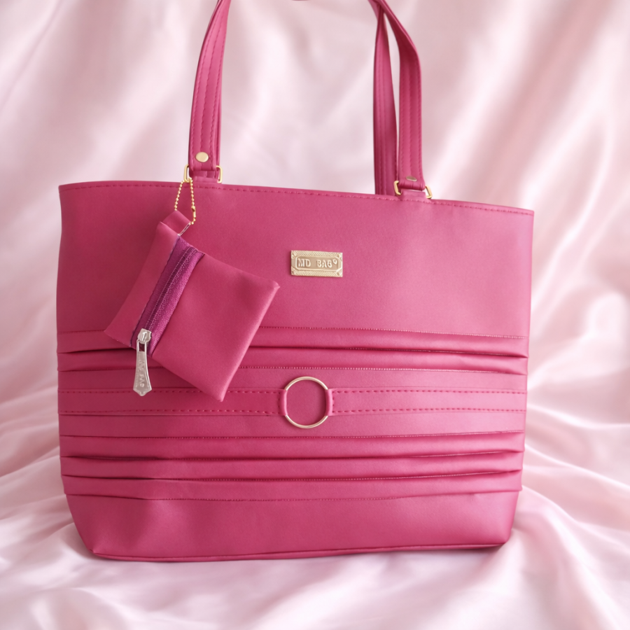 Trendy pink tote handbag with elegant front detailing and matching mini zip pouch. Spacious, stylish and perfect for office, shopping and daily use.