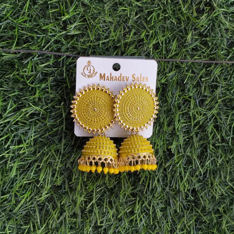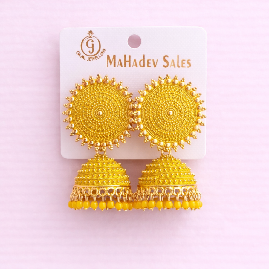 Elegant yellow gold-plated traditional jhumka earrings with sunburst stud design and matching yellow bead drops, perfect for festive and wedding wear.