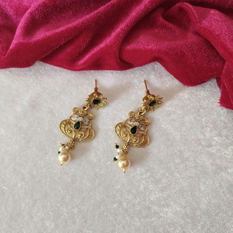 Traditional Gold Plated Temple Style Necklace Set with Green Beads & Matching Earrings