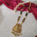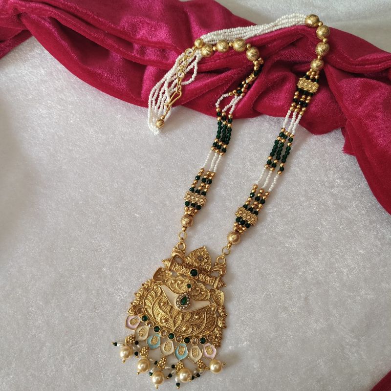 A stunning gold plated temple style necklace set with green bead chain, peacock pendant, and matching earrings, perfect for weddings and festive occasions.