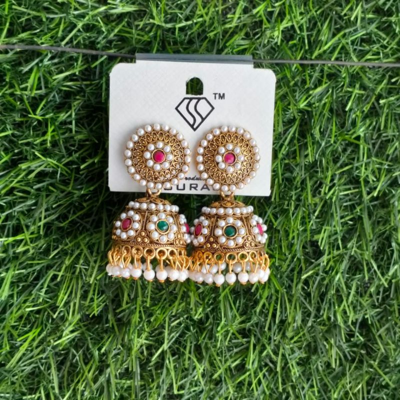 Traditional Kundan Pearl Gold Plated Jhumka Earrings with Red & Green Stones