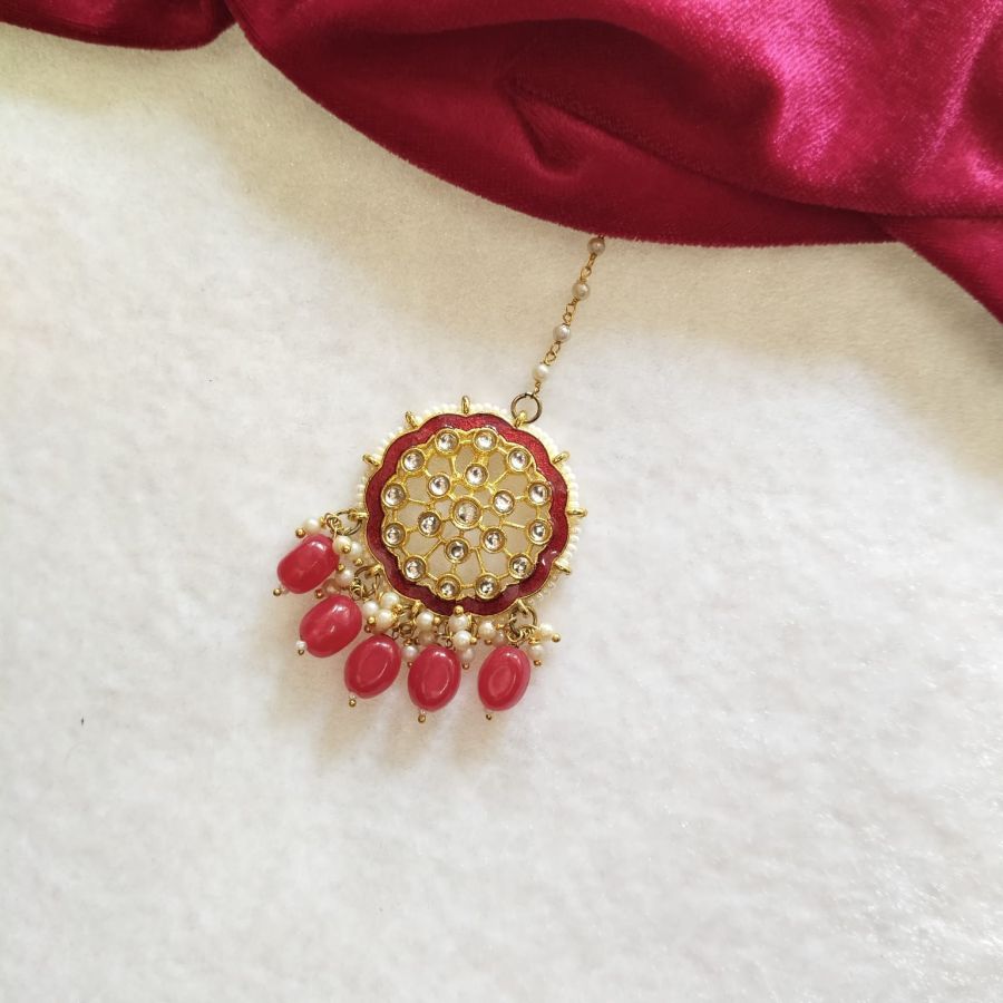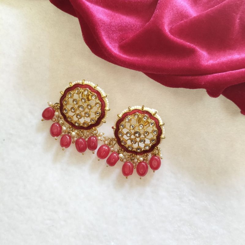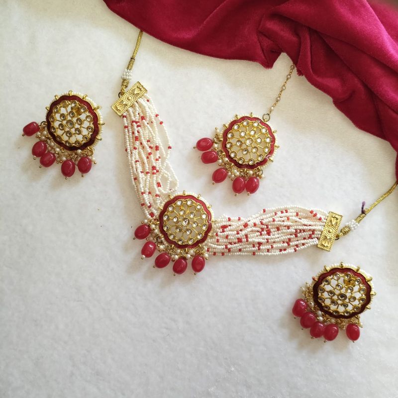 White & Red Beaded Kundan Necklace Set with Matching Earrings