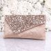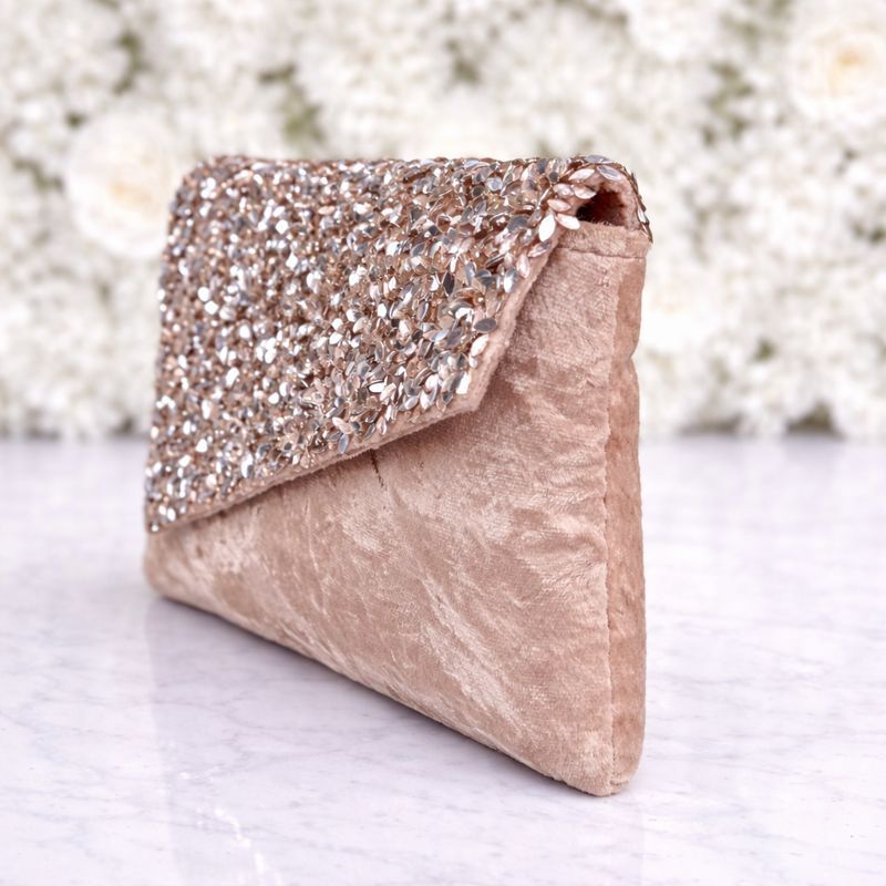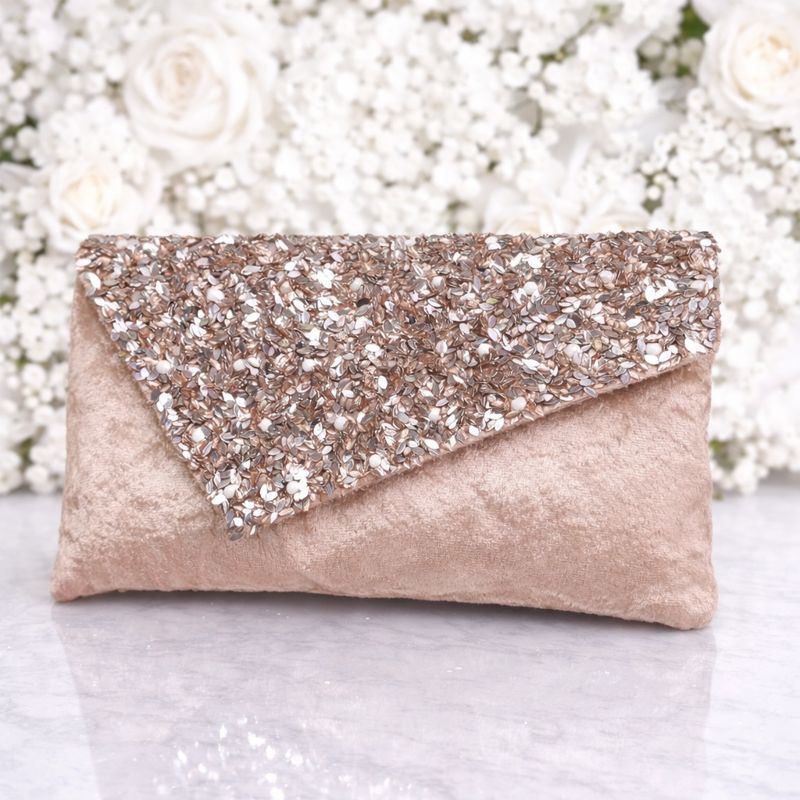 A stylish beige velvet envelope clutch with sparkling sequin flap design, perfect for weddings, parties, receptions, and festive occasions.