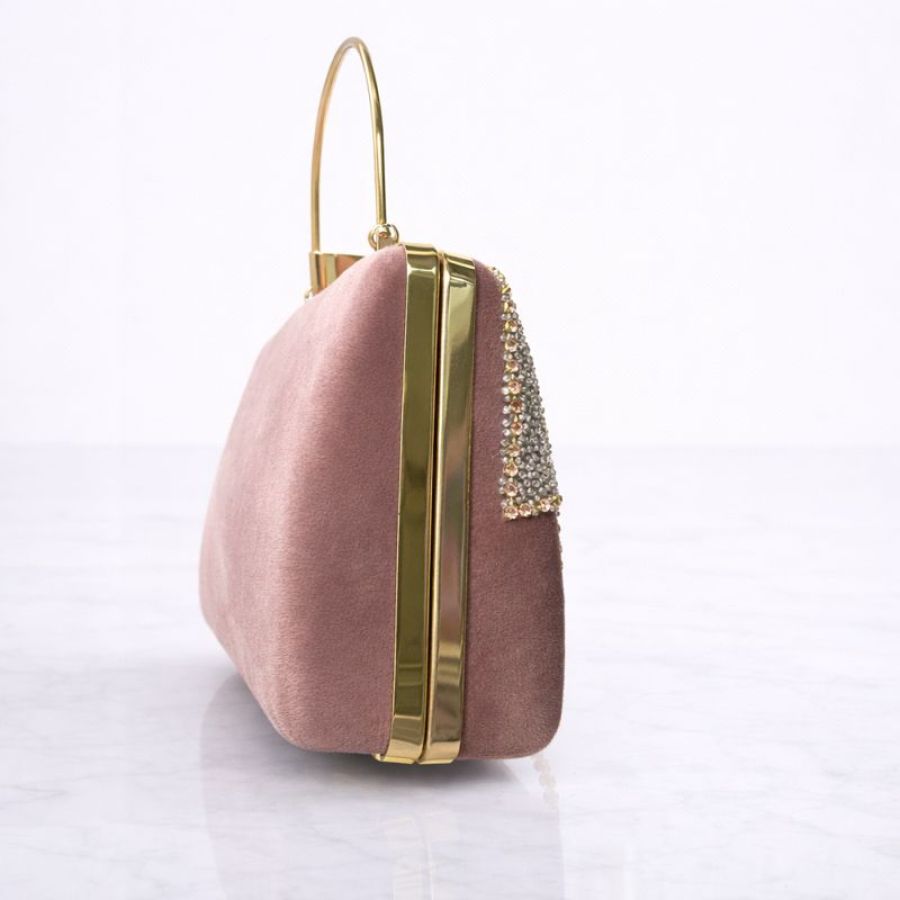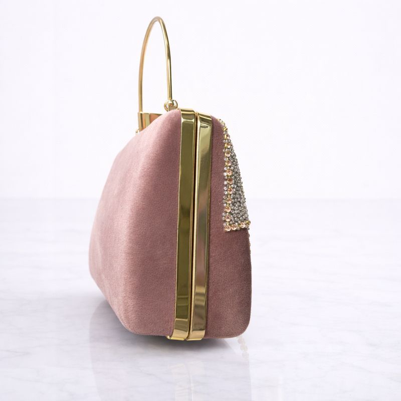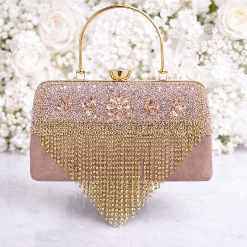 Women’s Peach Crystal Fringe Party Wear Clutch Bag with Golden Handle