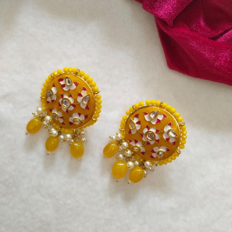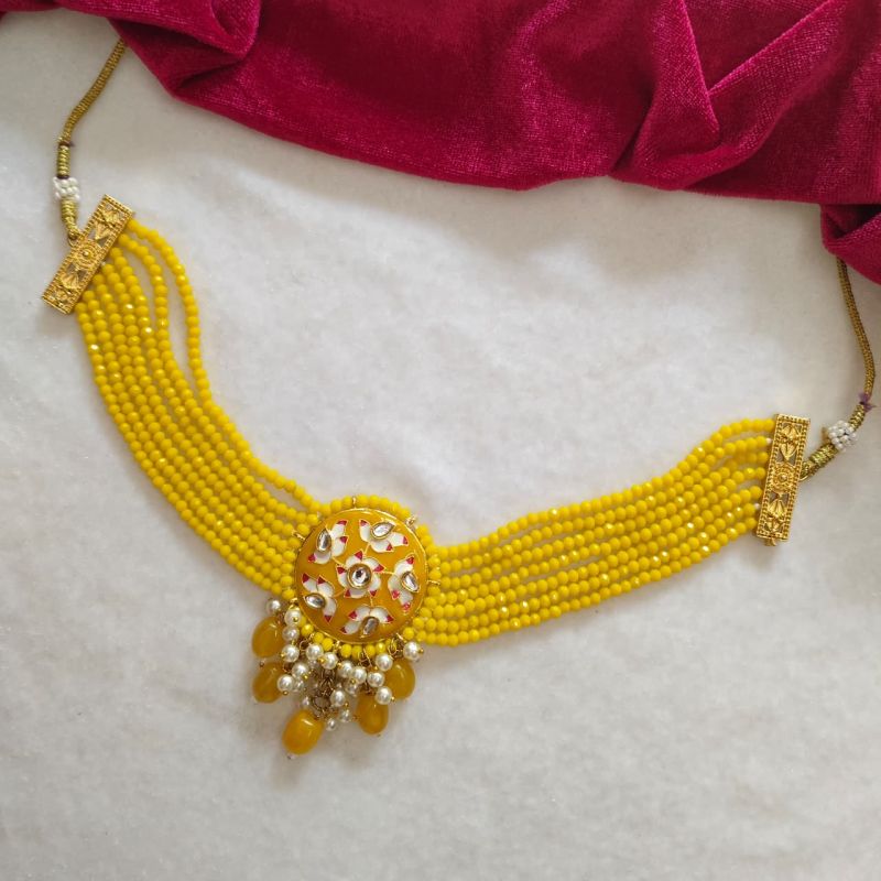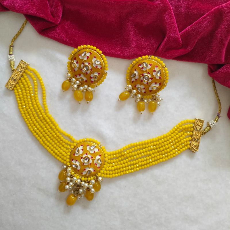 Yellow Beaded Kundan Style Choker Necklace Set with Earrings