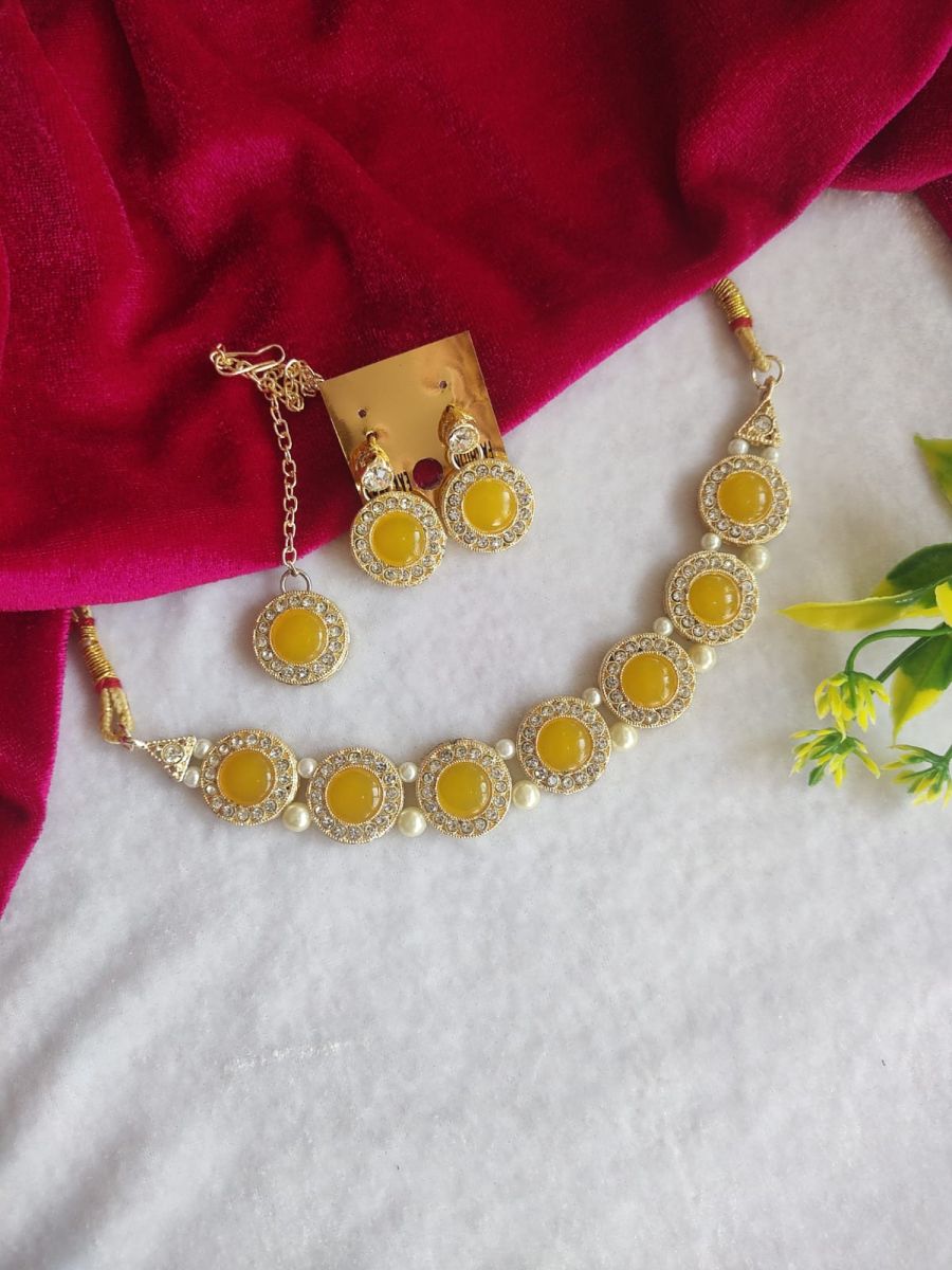 A beautiful yellow stone choker necklace set embellished with sparkling crystals and pearl accents. Perfect for festive, wedding, and party occasions.